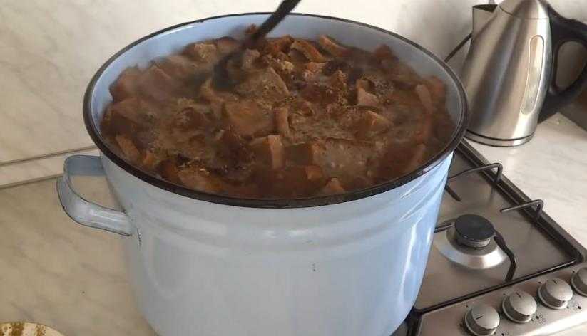 Отправить подсушенный хлеб в кипяток, высыпать к нему половину хмеля. Проварить на слабом огне в течение 40 минут, периодически помешивая деревянной ложкой.