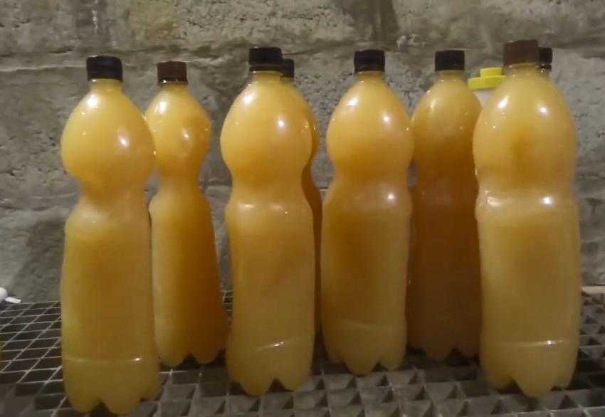 - Быстро охладить проваренную массу, отфильтровать ее через дуршлаг с марлей в продезинфицированный пластиковый бак для последующего брожения. Посыпать поверхность дрожжами, отправить в теплое место под гидрозатвор на 10 дней. Разлить по емкостям, на дно которых положить декстрозу, закрутить крышками и поместить в холод на 2 недели.