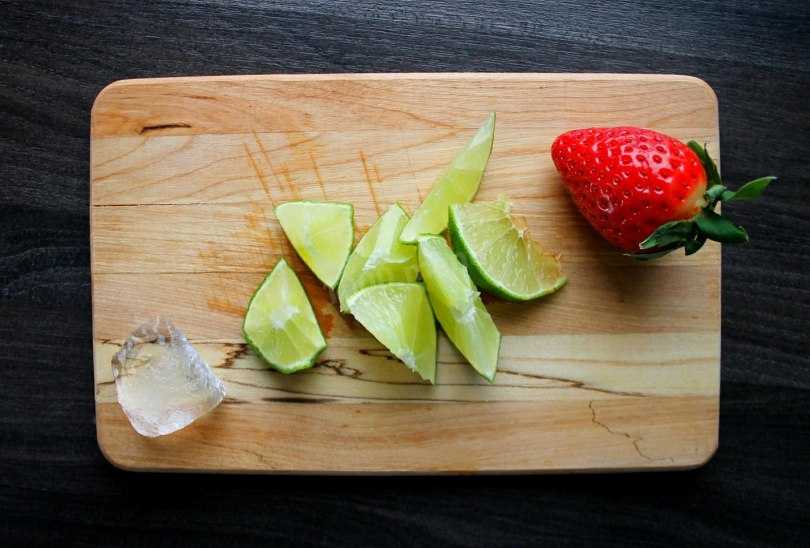 - Поместите в чашу блендера 400 г клубники, 100 мл лаймового сока, 100 мл сиропа и 5 мятных листьев.