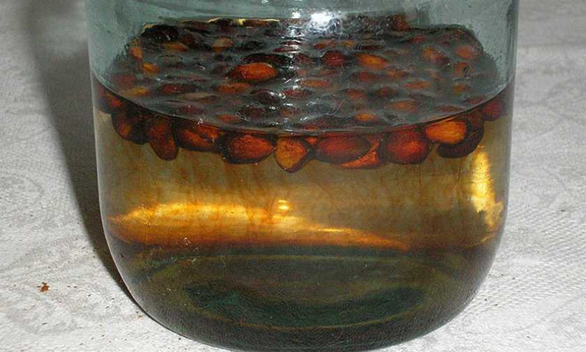 - Залить ядра самогоном и поставить в теплое место на 20 мин.