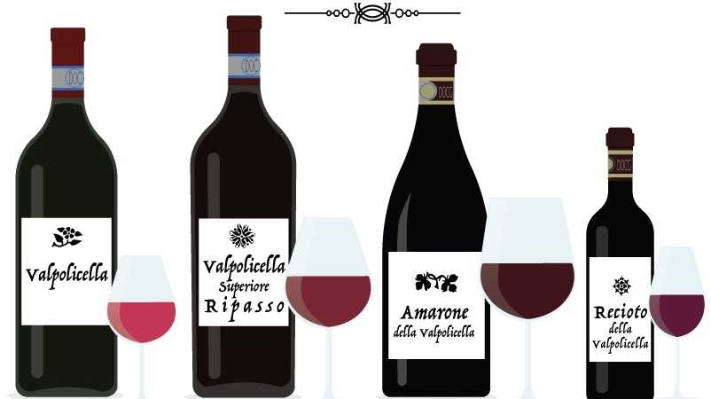 - Valpolicella (Вальполичелла) — красное вино, полученное из местных сортов винограда — Корвины и/или Корвиноне и Рондинеллы.