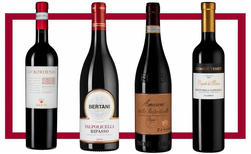 Слева направо: Santi Bardolino Classico Ca’ Bordenis 2020; Bertani Valpolicella Ripasso 2019; Zenato Amarone della Valpolicella Classico 2017; Domini Veneti Recioto della Valpolicella Classico Vigneti di Moron 2016
